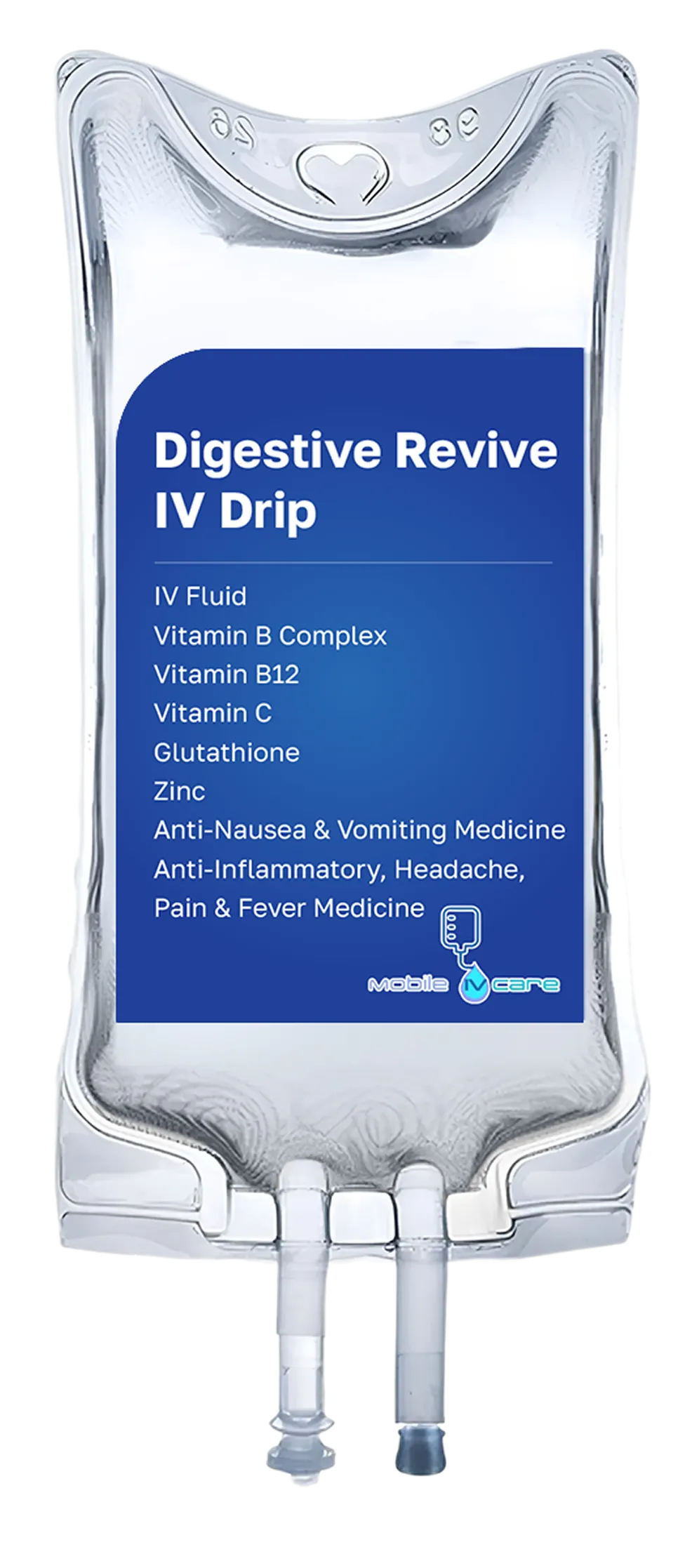 Packed with Vitamin B-Complex, magnesium, electrolytes, and anti-nausea medication, our Digestive Revive IV Drip soothes inflammation, supports enzyme function, and restores essential nutrients lost due to poor digestion or illness. The carefully formulated infusion helps reduce cramping, acidity, and fatigue — so your digestive system can recover naturally and comfortably.